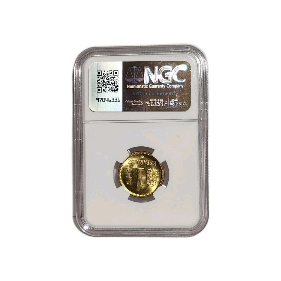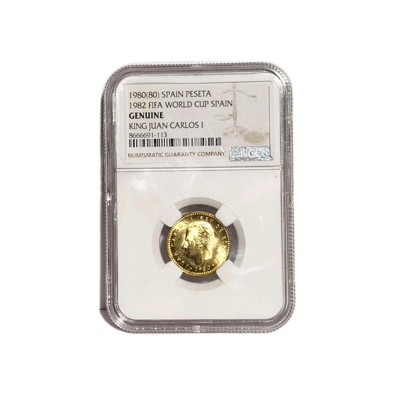 The product is a genuine 1982 FIFA World Cup Spain Peseta coin featuring King Carlos I, minted in Spain in 1980. The coin is certified by NGC and is a valuable collectible for numismatists interested in European coins. It commemorates a significant historical event, making it a unique piece for collectors of world coins.