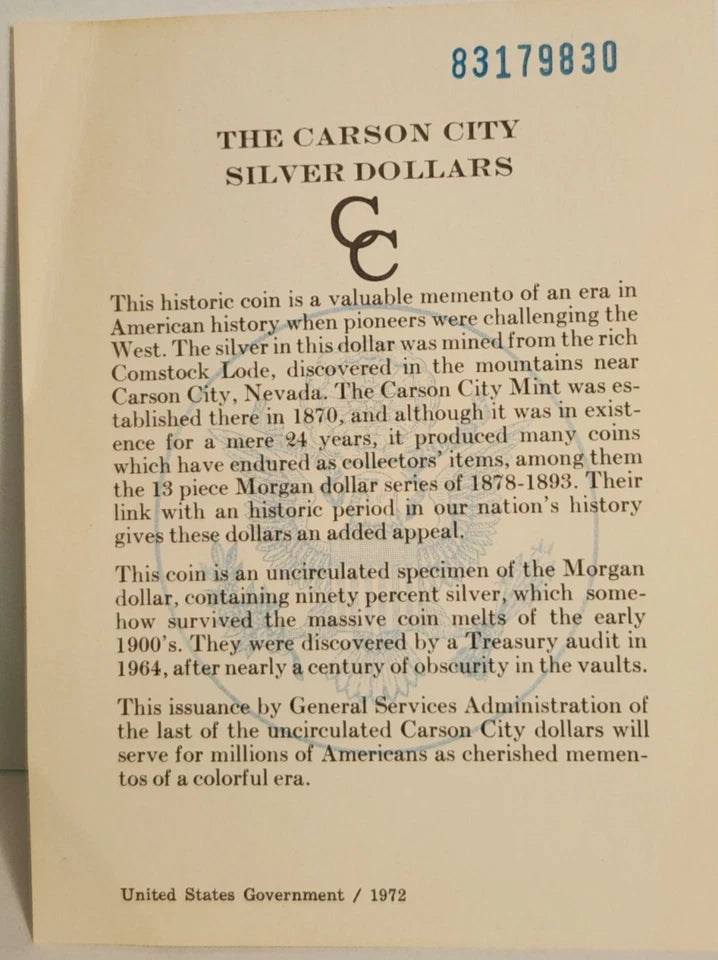 Carson City 1883 Morgan Silver Dollar uncirculated rare history COA included
