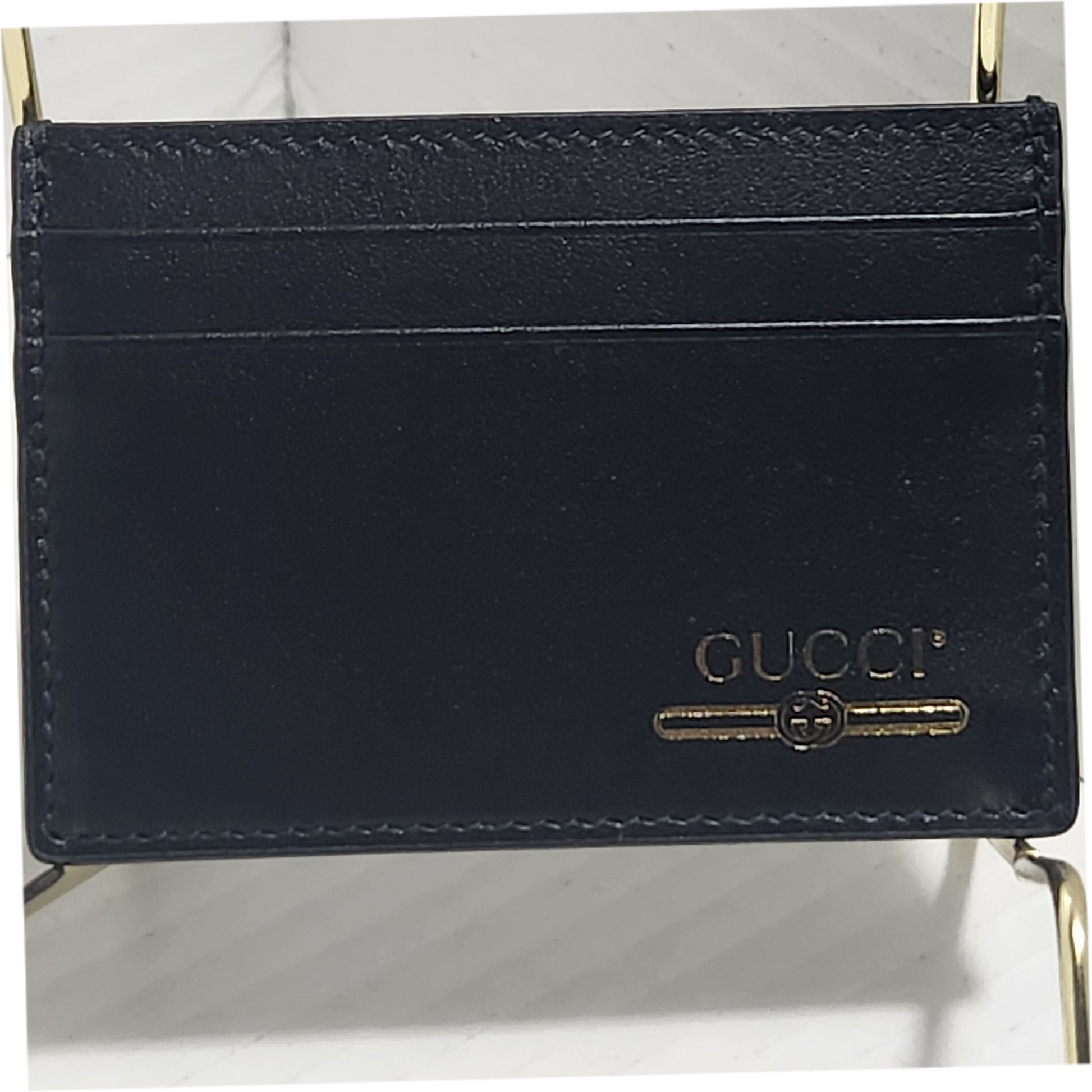 The Gucci Leather Card Holder wallet in black with gold monogram detailing is a stylish accessory for men. Crafted from luxurious leather, this wallet features a metal theme with a sleek design. Perfect for organizing cards and cash, this Gucci wallet combines functionality with a touch of elegance, making it a must-have item for any fashion-conscious individual.