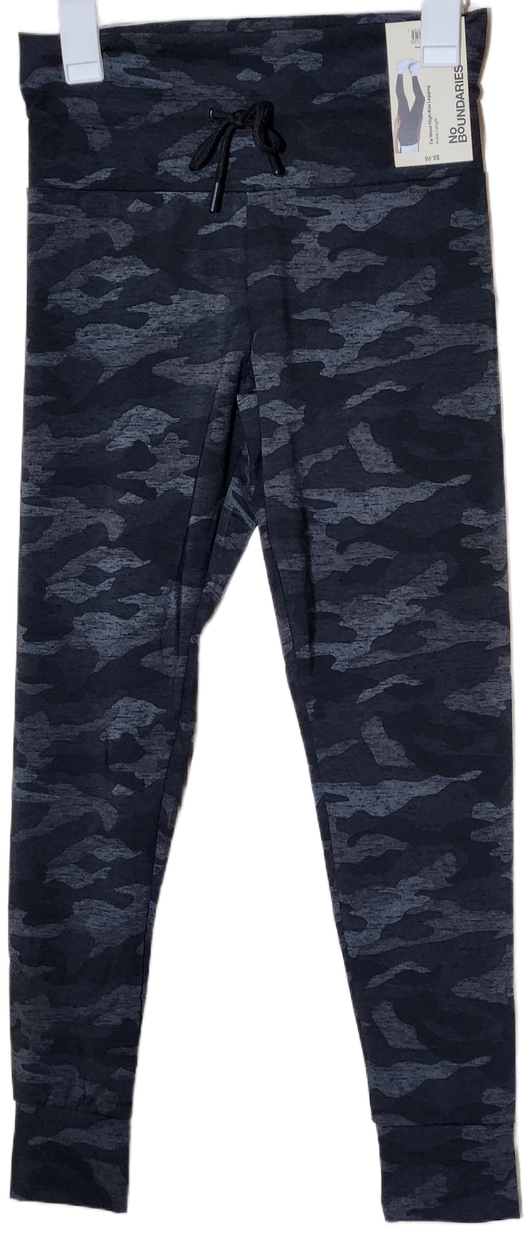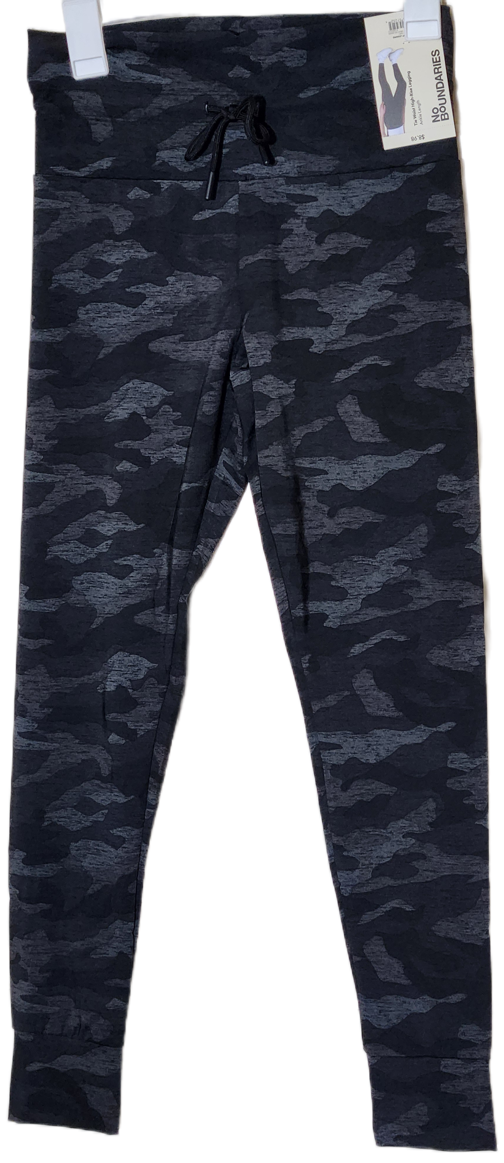 Woman's No Boundaries Camo Black Gray Tie Waist High Rise Ankle Leggings in size S/M are perfect for any occasion, whether it's travel or casual wear. Made from a comfortable blended fabric, these leggings feature an elastic waist for easy comfort. The high-rise design and ankle inseam add a stylish touch, while the dark camouflage pattern gives them a versatile look for any season. Easy to care for and machine washable, these leggings from No Boundaries are a must-have addition to any woman's wardrobe.